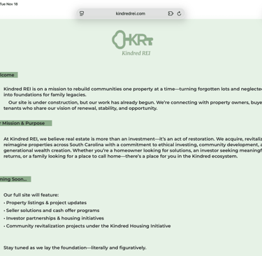 About the Project: This project focused on creating a high-impact digital presence for Kindred REI—an investment and revitalization brand with a strong mission and a growing portfolio. The goal was to establish an online foundation quickly, allowing the client to begin attracting interest and building credibility while the full website undergoes development.