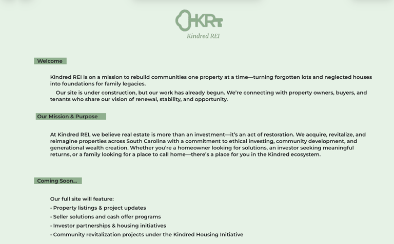 Kindred REI now has an active, credible online presence that introduces the brand, invites engagement, and supports their operations while the full, long-form, multi page website is being completed.